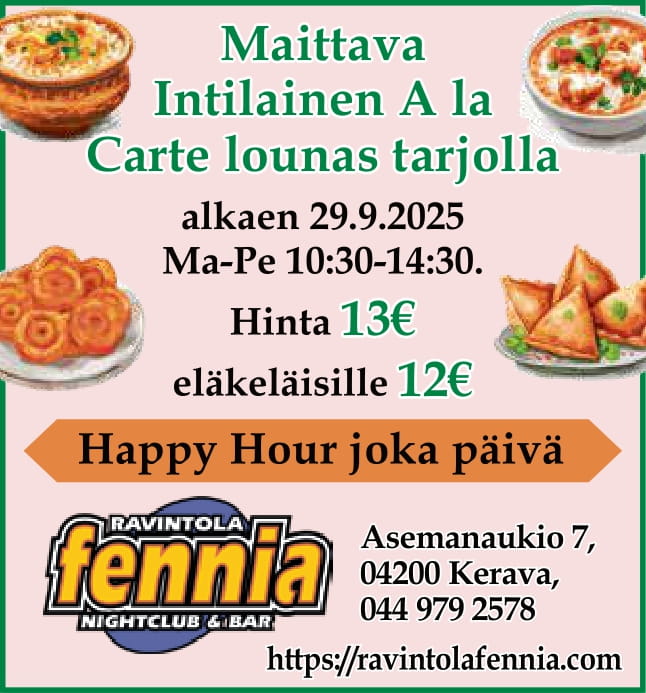 Ravintola Fennia is the ultimate hub for joy, fun, party and an ultimate place for people to come together and spend a good time to relax themselves with a perfect combination of Live Music and good Food. We provide you the choice of Finnish cuisines and authentic delicacies of Indian Cuisines. Following are the Opening Hours : 9:00-01:00 (Monday - Sunday) . We will also have DJ Nights and Karaoke on two different dance floors on Every Friday and Saturday. There are many more Live Programs coming shortly. Beer Lovers@ You will have the Happy Hours everyday between 9:00-21:00 Ravintola Fennia is also excited to announce that everyone of you will also find : Buffet Lunch from Monday to Friday from 10:30-15:00 Buffet Lunch on Saturday and Sunday from 12:00-17:00